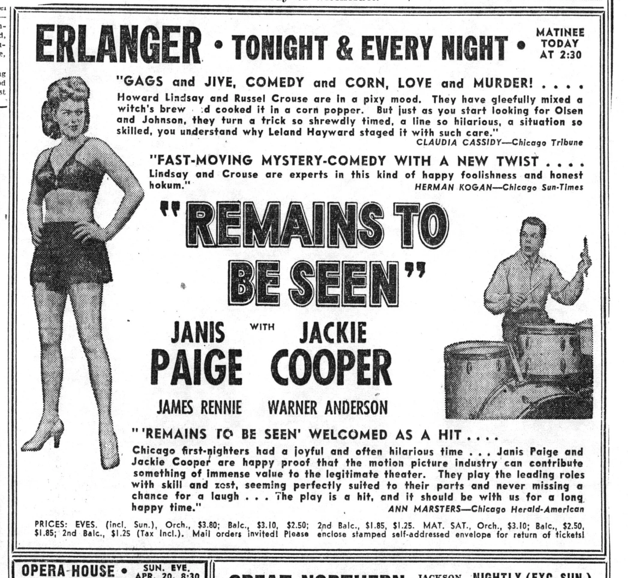 “Howard Lindsay and Russel Crouse have by no means concocted another Arsenic and Old Lace, but Remains To Be Seen is a sufficiently funny whodunit that mixes homicide and sex in equal parts.”